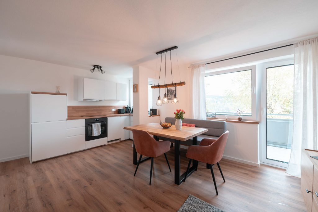 Lasst den Wander- oder Ski-Tag in der hellen Wohnküche ausklingen oder gönnt euch einen Kaffee auf dem Balkon mit Blick auf den großen Alpsee.